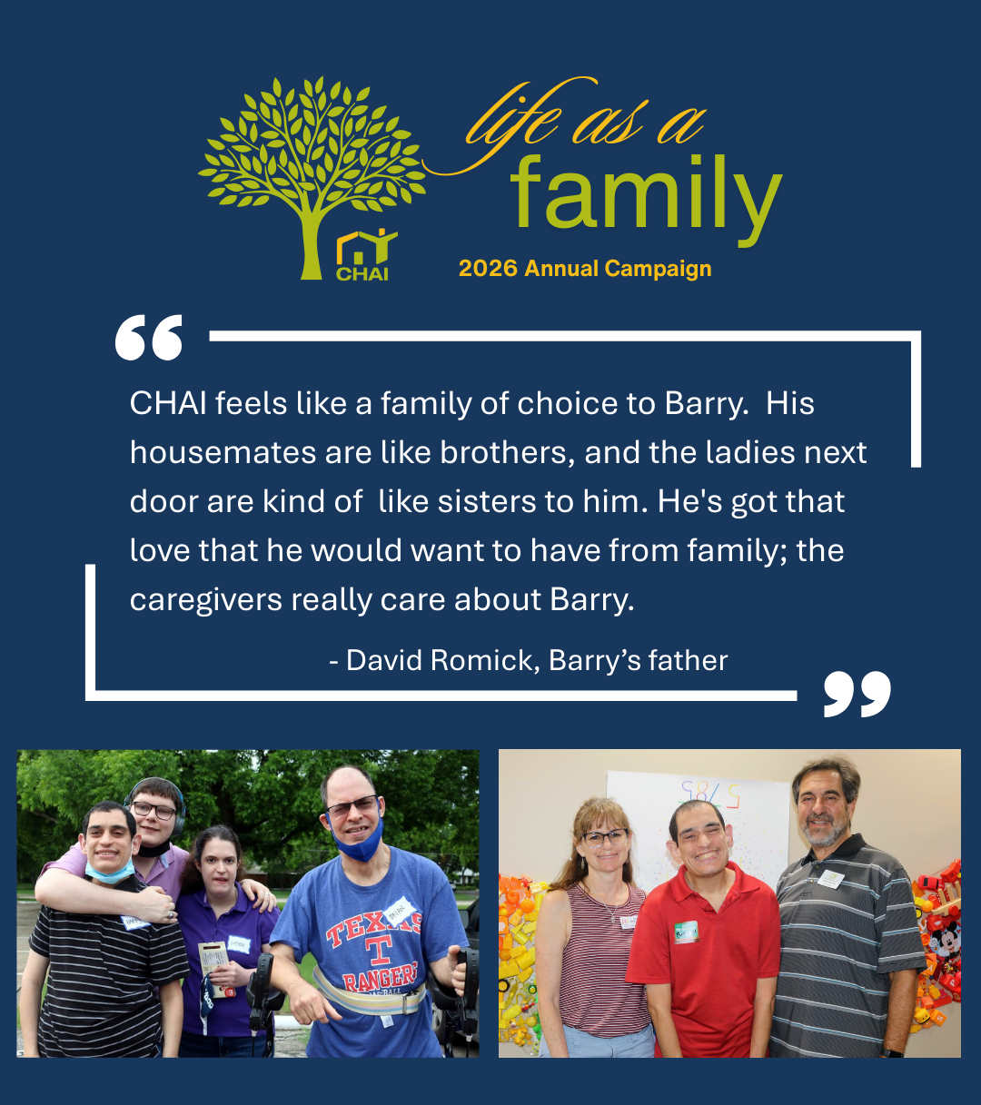 Generous contributions from individuals, businesses and foundations make it possible for CHAI to provide the ongoing exceptional programs and services that touch the lives of adults with intellectual disabilities, and their families, each and every day.